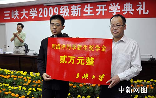 開學(xué)典禮上,三峽大學(xué)校長李建林為5名新生頒發(fā)錄取通知書,三峽大學(xué)黨委副書記何偉軍為周海洋頒發(fā)了2萬元新生獎學(xué)金。隨后,周海洋作為新生代表發(fā)言,他說,自己是懷著感恩的心態(tài)進入三峽大學(xué)的,站在新的人生起點,他最大的希望是4年內(nèi)學(xué)有所成,以此報答學(xué)校的培養(yǎng)和家人的厚望。周海洋的發(fā)言不似他的文章那般酣暢淋漓,而是顯得有點語無倫次,他多次表示是由于太激動的緣故。