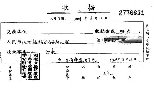 6月15日,學(xué);I集了45萬元現(xiàn)金,匯給了楊某的指定賬戶。令人意外的是,這個賬戶并不是學(xué)校的公共賬戶,而是一個名叫“王貞”的私人賬戶。等他們拿到收據(jù)后,上面蓋的公章是“湖北省經(jīng)濟(jì)管理干部學(xué)院博智教學(xué)站”。