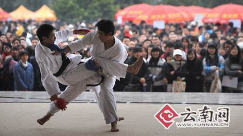手握一根1.5米的木棍,身著藍色訓練服的李萍表演起了“棍術(shù)”。這不是普通的武術(shù)表演,而是在云南省師范類畢業(yè)生專場招聘會上,大學生推銷自己的別樣方式。