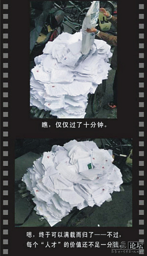 網(wǎng)友“干點什么好捏”日前在論壇上發(fā)出圖文帖《關(guān)于招聘,啥都不說了(應(yīng)屆生看完都得哭)》。展示了一組由其拍攝的,顯示大量應(yīng)聘者的求職簡歷被招聘單位當廢紙賣掉的圖片!案牲c什么好捏”更別出心裁地將拍到的連串圖片以黑白膠片的形式制作串聯(lián)起來,配上旁白,并將之命名為《超袖珍的電影:一個白色的幽默》,更在標題下特別“奉勸”此片“求職者與應(yīng)屆生不宜”。