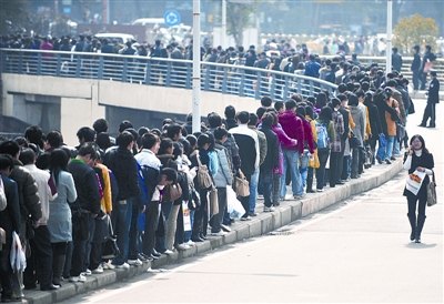 20 日,“湖北省2009年新春大型人才招聘會”在華中科技大學(xué)光谷體育館舉辦。這場招聘會是2009年春節(jié)后首場針對大學(xué)生的招聘會,近4萬名求職者擁向會場,隊(duì)伍最長時有3公里。上圖:當(dāng)天下午1時20分,一些學(xué)生投完簡歷走出體育館,而門外還聚集著大量等待進(jìn)場的學(xué)生。