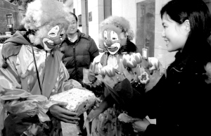 頭戴紅鼻頭鬈發(fā)的小丑面具,身穿一套連體的彩裝寬松衣……昨天下午,當手捧鮮花禮品、這身打扮的袁楓和王洪福從威寧路一乘上地鐵二號線,許多乘客還以為又巧遇“雷人”了。其實他們都是大學生快遞員,正在去送祝?爝f的途中。
