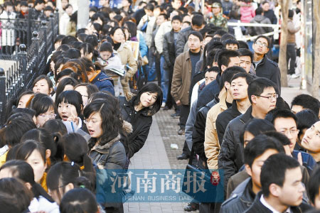 上午7時(shí)30分,河南人才市場(chǎng)的大門還沒有開,求職心切的人們已在大門外排起了長(zhǎng)隊(duì)。很快,一男一女兩行隊(duì)伍排了足足500米長(zhǎng)。