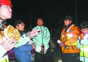 昨天晚上,當(dāng)記者來到北京市植物園西門的時(shí)候,門旁邊的花池子邊上,放著救援隊(duì)員帶來的烙餅、鴨脖子、雞腿,還有成箱的礦泉水,下午4時(shí)出發(fā)前兩組隊(duì)員剛剛返回,很多人因?yàn)樯仙角拔闯燥埗奸_始“狼吞虎咽”。