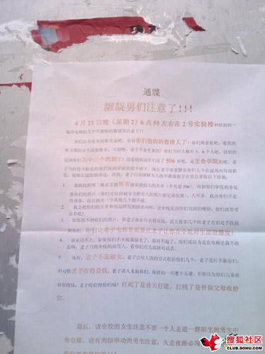 前日,位于成都清水河附近的一所高校教學樓前,張貼出一張醒目的告示,上面寫著“齷齪男們注意了”。告示上說,在本月21日傍晚6點55分左右,這位女學生在2號實驗樓與幾個男生一起乘電梯,被他們在電梯里戲弄,十分氣憤,她記下了幾個男生的臉和他們上課的教室。她要求幾個男生在本周內寫道歉信,且要貼在該告示的旁邊。