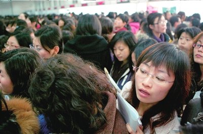 昨天(4日)上午9點(diǎn),女大學(xué)生專場招聘會在北京市畢業(yè)生就業(yè)市場舉辦。此次招聘會共有50家企事業(yè)單位參加,600個崗位提供給前來應(yīng)聘的女大學(xué)生。市人事局畢業(yè)生就業(yè)服務(wù)中心統(tǒng)計,截至下午2點(diǎn)招聘結(jié)束時,約5000人參加招聘,平均8人爭取1個崗位。