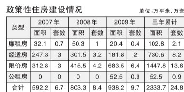 在住房保障方面,自2007年至2009年,本市已累計(jì)建設(shè)了24.8萬套政策性住房。其中限價(jià)房套數(shù)最多,達(dá)到13.6萬套。