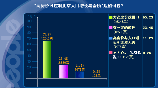 截止到14日晚21時(shí),參與調(diào)查的網(wǎng)民共計(jì)70938人,其中有46245人認(rèn)為這是在為高房?jī)r(jià)找借口,直接質(zhì)疑任志強(qiáng)的“素質(zhì)”,持此一觀點(diǎn)的網(wǎng)民占總?cè)藬?shù)的比例高達(dá)65.2%。此外另有11.2%的人也明確表示房?jī)r(jià)與人口增長(zhǎng)和素質(zhì)無(wú)關(guān)。不過(guò),也有近四分之一的網(wǎng)民認(rèn)為任志強(qiáng)的說(shuō)法"有一定道理"。