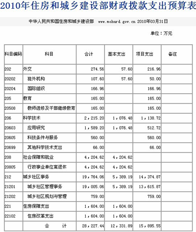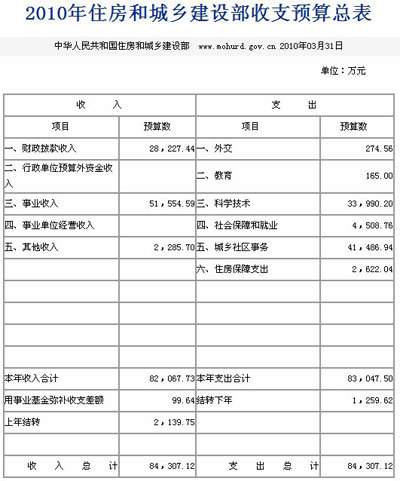 中新網(wǎng)3月31日電 住房和城鄉(xiāng)建設(shè)部網(wǎng)站今日發(fā)布住房和城鄉(xiāng)建設(shè)部部2010年部門預(yù)算表,其中包括2010年收支預(yù)算總表以及2010年財(cái)政撥款支出預(yù)算表。這是繼國(guó)土資源部及財(cái)政部公開部門預(yù)算后,第三個(gè)公開預(yù)算的中央部委。