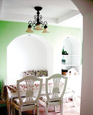 就餐環(huán)境的色彩配置對(duì)家人的就餐心理影響很大。孫女士在裝飾餐廳時(shí),選擇淺綠色為主色調(diào),搭配上白色餐桌椅。明朗輕快的色調(diào)不但能增進(jìn)就餐者的興致,刺激食欲,而且能營造一種溫馨、甜蜜的氛圍(如圖②)。