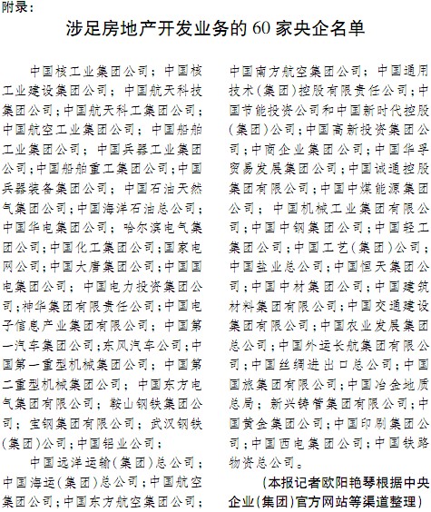 中國經(jīng)濟(jì)時(shí)報(bào)記者近日根據(jù)中央企業(yè)(集團(tuán))官方網(wǎng)站等渠道,整理出一份包含了60家涉足房地產(chǎn)開發(fā)的企業(yè)名單(見附錄)。