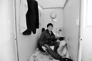 黃日新的膠囊公寓位于六郎莊一幢三層灰色民居的頂層。來(lái)到“膠囊公寓”門(mén)口,眼前一間10平方米左右的小屋里并排立著2個(gè)類(lèi)似儲(chǔ)藏室、通體白色的隔間。每個(gè)隔間大約占地2平方米,高約2米、長(zhǎng)2.4米、寬0.72米。“這床就連姚明也可以睡,他可以從門(mén)這邊開(kāi)始睡,就把腳伸到電腦桌里面去了!秉S日新說(shuō)。記者看到,隔間外安著雙鎖防盜門(mén),門(mén)內(nèi)無(wú)縫隙地鋪著張窄長(zhǎng)的木板床,床下很空,可以放行李和雜物。床的盡頭有張電腦桌,墻上有盞圓形壁燈,壁燈下面有寬帶接口、有線(xiàn)電視接口和兩組電源插座!澳z囊”的上方由鐵網(wǎng)焊接而成,這不僅使得屋頂?shù)臒艄饪梢酝高^(guò)網(wǎng)子保證隔間內(nèi)的采光,還可以充分利用房子的暖氣、空調(diào)。拍拍“膠囊”的墻板,有些薄,隔音效果也不太好。黃日新解釋說(shuō),許多隔音材料的防火性能不好,可防火才是第一位的,于是,他舍棄了隔音。而考慮通風(fēng),所以也沒(méi)有封頂!暗珵榱吮Wo(hù)個(gè)人隱私,我在頂部安了兩根鋼筋桿,可以?huà)煲路,也可以(huà)臁敽煛虾缶褪莻(gè)封閉空間!