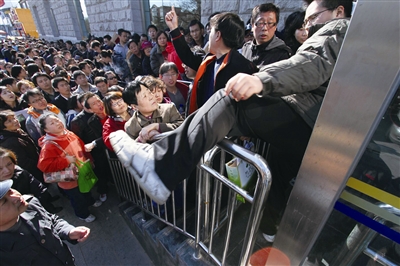 8時(shí)40分許,現(xiàn)場已聚集了上千人,民警和保安趕來維持秩序,工作人員正在商討如何讓大家安全地進(jìn)入大廳,以免發(fā)生踩踏。