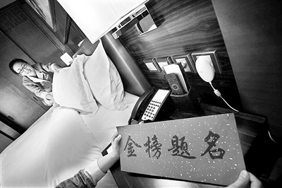 前天下午,記者在北京康源瑞廷酒店內(nèi)看到,工作人員將一張寫有祝愿考生“金榜題名”字樣的卡片擺放在床鋪和床頭柜等明顯位置,使得房客一進(jìn)門就能看到。