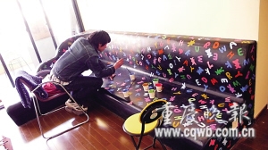 吳女士的家墻壁是在墻體進(jìn)行人工手繪。與用墻紙、乳膠漆相比,手繪墻畫不僅不會掉色,而且很便宜。吳女士家,四幅墻畫和沙發(fā)手繪,一共不到6000元。(記者 陳寒星)