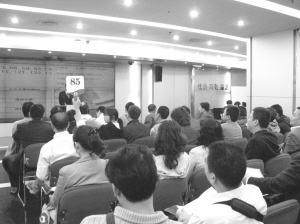 拍賣師萬華介紹,今年拍賣會的火熱與去年的冷清場面形成鮮明對比。在去年樓市低迷時(shí)期,拍賣現(xiàn)場常常只零散地坐著10多個(gè)競買人,經(jīng)常有房產(chǎn)因參與競拍人數(shù)不足兩人而流拍,只有進(jìn)行多次調(diào)價(jià)多次拍賣,還有許多房產(chǎn)無人競價(jià)而以底價(jià)成交,即使有人競買也是寥寥數(shù)人。到拍賣后半場,由于有人提前離場,稀稀拉拉的幾個(gè)人,也再沒舉牌熱情。