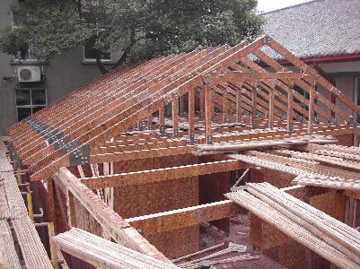 據(jù)介紹,竹結(jié)構(gòu)住宅所用的結(jié)構(gòu)構(gòu)件和連接件都是采用工廠標準化生產(chǎn),蓋房子就像搭積木一樣。施工過程類似于北美的平臺式輕型木結(jié)構(gòu)住宅施工,其樓蓋和墻體分開建造,因此已建成的底層樓蓋可以作為上部墻體施工時的工作平臺。通常墻體骨架可在工作平臺上拼裝,然后人工抬起就位。墻體也可在其他地方先拼裝好,再運到施工現(xiàn)場就位。