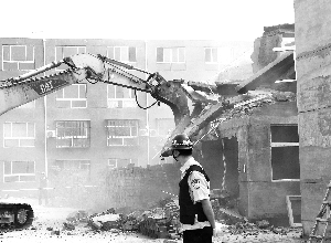 最后,在確定房間內無人無物的情況下,機械設備將五排連體二層住宅小樓中的一棟全部拆除、四棟部分拆除。直到中午十一點,執(zhí)行工作基本完畢。