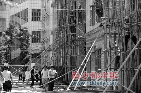 昨日中午11時30分,記者再次到達現(xiàn)場,秀新(即埔廈新村)1巷、2巷、3巷、4巷、5巷等地,還有數(shù)棟樓房外搭有腳手架,木板、鋼筋散落一邊。橫崗街道執(zhí)法隊正在拆除一棟樓房的腳手架。龍崗區(qū)城市管理局副局長兼查違辦主任何永華在一旁督戰(zhàn)。
