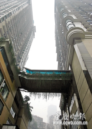 嘉園有業(yè)主500余戶,錦園有業(yè)主600余戶。當(dāng)初,開發(fā)商特意在兩樓之間設(shè)計了一座天橋,目的是讓兩個小區(qū)的空中花園、健身器材等可以共享,更重要的是方便兩個小區(qū)業(yè)主出入——錦園的業(yè)主可以經(jīng)嘉園直達臨江門、解放碑,嘉園業(yè)主也可經(jīng)錦園到一號橋。