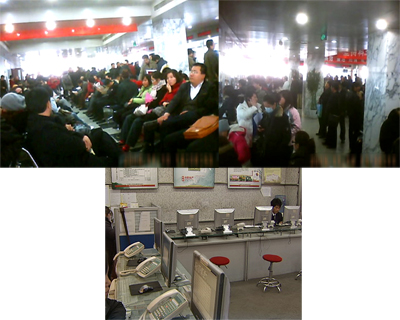 為了了解過戶的實(shí)際情況,記者采用了隱蔽拍攝的方式。在朝陽區(qū)房產(chǎn)交易中心記者看到,整個(gè)大廳到處都是排隊(duì)等待過戶和辦證的購房者。幾排座椅已經(jīng)坐滿了人,過道上和各個(gè)窗口都擠滿了人。有的人從早上5點(diǎn)就起來排號(hào),在長(zhǎng)時(shí)間的等待中,甚至都睡著了。由于怕錯(cuò)過號(hào),有的人到了吃飯時(shí)就隨便買點(diǎn)盒飯打發(fā),記者了解到,最近幾周來,這里都是人山人海。