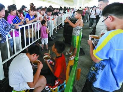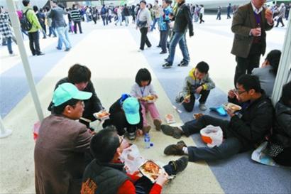 鴨脖子、雞爪、雞翅、黃瓜、雞蛋、面包……下午五點多,記者在園區(qū)看到,不少游客一家人攤開折疊椅,拿出包內(nèi)的食物開始野餐。沒吃一會,女主人又買來4支冰激凌和若干串烤肉,一家人邊啃烤肉邊吃冰激凌,非常開心。 “我們一家人從江西南昌過來,早就聽說世博園內(nèi)到處都要排隊,所以索性從家里帶了點吃的東西過來,主要是為了節(jié)約排隊用餐時間!迸魅诉呎f邊向記者展示她帶的食物。