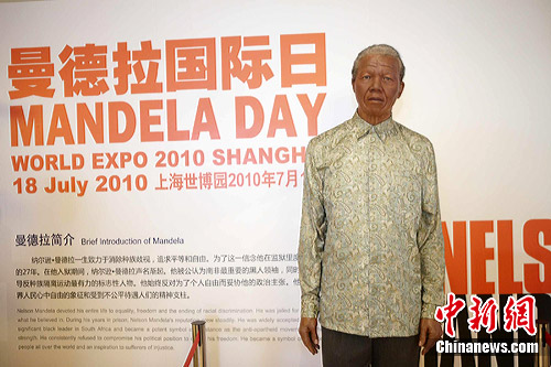 當天,一尊來自上海杜莎夫人蠟像館的曼德拉蠟像“走入”南非館,栩栩如生的造型讓有人覺得仿佛這位“人權斗士”真的親臨世博園,游客紛紛掏出相機、駐足與偉人留影。