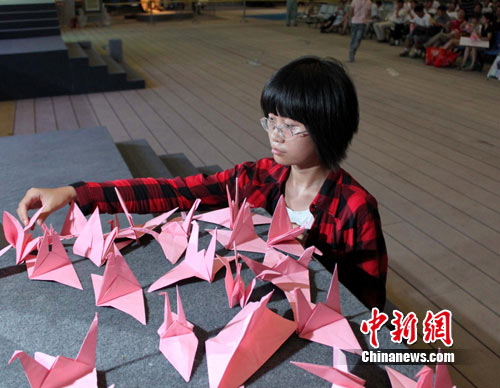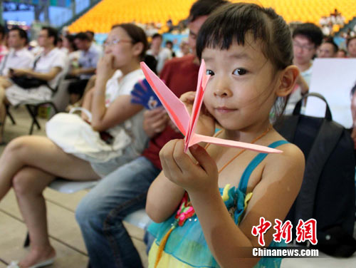 14日晚,在中國(guó)元素活動(dòng)區(qū)里舉行的“中國(guó)元素民歌賞析會(huì)暨高暢經(jīng)典紅歌音樂(lè)會(huì)”上,主唱高暢和前來(lái)觀看演出的千名游客同折千只紙鶴為舟曲祈福。