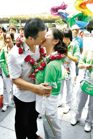 編號(hào):20108161314。兩位新人從園區(qū)志愿者部部長(zhǎng)夏科家手上接過了獨(dú)一無二的世博結(jié)婚證。這個(gè)編號(hào)不但是對(duì)他們婚禮吉時(shí)的記錄,也是對(duì)他們幸福生活的美好祝福!坝H一個(gè)!親一個(gè)!”圍在新人周圍的99位“小白菜”可不會(huì)輕易放過這位和自己朝夕相處的老師,開始起哄。大庭廣眾之下,施諾哪好意思,對(duì)著新娘的額頭就是一下蜻蜓點(diǎn)水,想要糊弄過關(guān)。“不算!不算!”聲音越來越響,不少游客也忍不住駐足觀望。迫于“群眾壓力”,兩人在七彩之心下深情一吻,接受所有人的祝福。