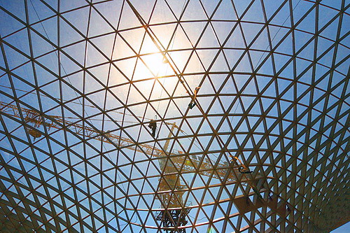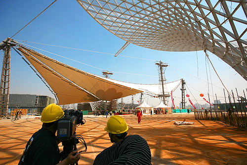 中新網(wǎng)4月30日電 據(jù)上海世博會官方網(wǎng)站消息,今天,世博軸上首批兩個喇叭狀的陽光谷正式落成,同時頂棚膜結(jié)構(gòu)張拉啟動,這標(biāo)志著世博軸上部主體工程即將全面完工。上海世博會執(zhí)委會專職副主任鐘燕群、上海世博局副局長丁浩等出席儀式。鐘燕群宣布啟動世博軸頂棚膜結(jié)構(gòu)張拉。