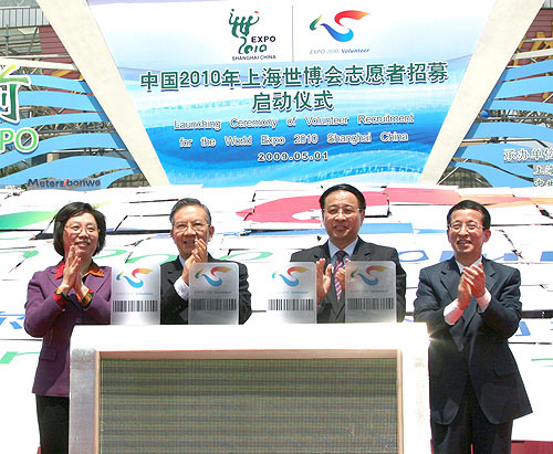 在東方明珠廣場(chǎng),1500多位曾在上海舉辦的歷次重大活動(dòng)中奉獻(xiàn)愛心的志愿者和各界市民代表齊集于此,參加世博會(huì)志愿者招募工作啟動(dòng)儀式。啟動(dòng)儀式前,上海市領(lǐng)導(dǎo)與志愿者代表們一起觀看了在北京天安門廣場(chǎng)舉行的中國(guó)2010年上海世博會(huì)天安門計(jì)時(shí)牌揭幕儀式的現(xiàn)場(chǎng)直播。上海市人大常委會(huì)主任劉云耕,上海市政協(xié)主席馮國(guó)勤,中共上海市委副書記、市文明委常務(wù)副主任殷一璀,上海市副市長(zhǎng)、市迎世博600天行動(dòng)城市管理指揮部總指揮沈駿共同開通了世博會(huì)志愿者招募網(wǎng)站報(bào)名系統(tǒng),全市72個(gè)志愿者工作站和上海世博志愿者網(wǎng)等6家網(wǎng)站同時(shí)開始面向社會(huì)接受志愿者的報(bào)名。中共上海市委常委、宣傳部長(zhǎng)、市世博會(huì)籌辦工作領(lǐng)導(dǎo)小組志愿者組組長(zhǎng)、市迎世博600天行動(dòng)社會(huì)動(dòng)員指揮部總指揮王仲偉發(fā)表致辭,歡迎廣大市民和國(guó)內(nèi)外人士踴躍參與上海世博會(huì)的志愿服務(wù)工作。中共上海市委常委、浦東新區(qū)區(qū)委書記徐麟,市人大常委會(huì)副主任王培生,市政協(xié)副主席、世博會(huì)執(zhí)委會(huì)副主任周漢民共同為世博會(huì)志愿者自行車宣傳隊(duì)授旗。