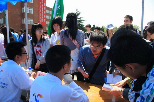 5月1日,中國2010年上海世博會倒計時一周年的日子,上海交通大學“中國2010年上海世博會”志愿者招募啟動暨上海交通大學上海世博會工作站成立儀式,在交大閔行校區(qū)內(nèi)舉行,1000余名學生來到現(xiàn)場進行咨詢。