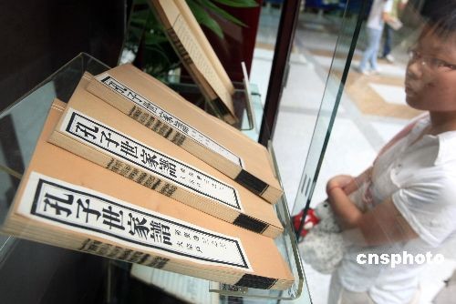 7月14日,在滬舉行的“尋根稽譜——上海圖書館藏家譜精品展”上,一部《孔子世家譜》吸引了眾多參觀者的目光。這部記載孔子后裔達(dá)七十余世的家譜,因其記錄的連續(xù)性和完整性,以及嚴(yán)謹(jǐn)?shù)捏w例、翔實(shí)的資料,號(hào)稱“天下第一譜”。 據(jù)介紹,上海圖書館現(xiàn)藏有中國(guó)家譜近2萬種20萬冊(cè),共計(jì)365個(gè)姓氏,是國(guó)內(nèi)外收藏中國(guó)家譜原件最多的公藏機(jī)構(gòu)。這次展出的60件展品,都是從館藏中挑選出來的精品。中新社發(fā) 湯彥俊 攝