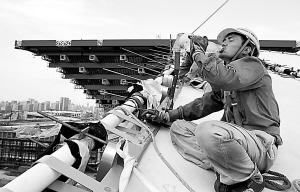 下午兩點,記者帶著溫度計來到世博工地外國館片區(qū),陽光下,水銀柱停留在40攝氏度上。走上5分鐘,汗水濕透了全身。高溫挑戰(zhàn)著每個建設者的意志力。在法國館將要完成的鋼結構屋頂上,幾個工人正在安裝最后的鋼架,為了避免曬傷,他們穿著長袖長褲的工作服,戴著安全帽。從屋頂爬下來時,每個人都像是剛從水里撈上來的。工人老張說,安全帽不能脫,汗水一刻不停地沿著帽子流下來,眼睛都睜不開,得一直用手擦。