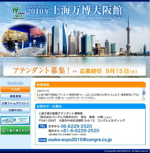 7月17日,記者從2010年上海世博會日本大阪城市最佳實踐區(qū)案例工作人員招聘網(wǎng)站上獲悉,世博會日本大阪城市最佳實踐區(qū)案例開始招聘工作人員,計劃招聘約15名,工作崗位包括日常接待、講解、導(dǎo)游、VIP接待、活動宣傳等。受聘者將作為康格會展(上海)有限公司的員工被雇用,工作期限為2010年4月1日至10月31日。