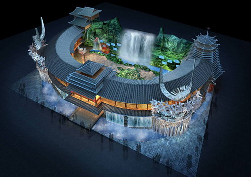 貴州館平均高度為7.2米,極端高度達8.5米,展示主題為“醉•美貴州,避暑天堂”。在600平方米的展示面積中,將貴州的自然山水和多元民俗文化巧妙結(jié)合,抽取風(fēng)雨橋、鼓樓、苗寨、銀飾和山水瀑布極具貴州特色的視覺元素,高度凝煉貴州人文自然風(fēng)貌以及“醉•美”和“避暑”的特色。強烈的視覺沖擊力和民俗特色,力求使絕大多數(shù)不了解貴州或從未踏足過貴州的參觀者,也能在第一時間內(nèi)對貴州館留下深刻的印象。