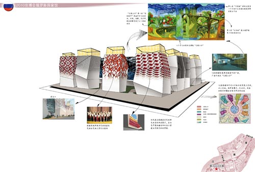 俄羅斯館占地6000平方米,是世博會最大的展館之一。它的外圍是12座不規(guī)則形狀的塔樓,聳立于草坪和水景之間,塑造出俄羅斯館傳統(tǒng)與現(xiàn)代相結合的外形。