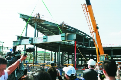 一邊籌資一邊建館的美國(guó)館,直到今年7月份才遲遲開(kāi)工,雖然在參展資金上有些捉襟見(jiàn)肘,但其6000平方米的占地面積仍然是所有外國(guó)自建館中最大的之一。讓人吃驚的是,美國(guó)館僅用了兩個(gè)多月的時(shí)間,就完成了總體結(jié)構(gòu)封頂(見(jiàn)上圖),可謂是后來(lái)居上。在建設(shè)工期上取得如此效率,和上海方面的積極配合協(xié)作是分不開(kāi)的。14日下午,新任美國(guó)駐華大使親臨世博園,參加了美國(guó)館的封頂儀式。