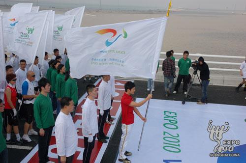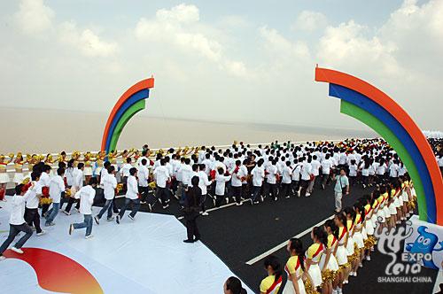 共青團上海市委書記、上海市世博會籌備工作領導小組志愿者組副組長潘敏為“大橋跑”發(fā)令起跑。起跑前,21名少女手捧取自沿長江21個城市采集而來的母親河水水樣,匯入長江入?,表達了志愿者的拳拳赤子之心,也表達了志愿者對上海世博會的美好祝愿。