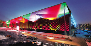 主題館的金屬色既不單調(diào),也不冷峻。整個建筑的明快線條和多變圖形,在金屬閃光中挾著一股現(xiàn)代暖風(fēng),迎面吹來。這個館堪稱世界級展館中的“巨無霸”:西廳2.5萬平方米,相當(dāng)于3個標(biāo)準(zhǔn)足球場;東廳兩層,各有1.7萬平方米;另外還有幾萬平方米的地下廳、中廳和下沉廣場。在世博會150年的歷史上,這是面積最大的一個展館。
