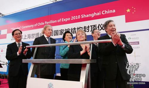 伴隨著歡快的民族音樂和熱情洋溢的智利舞蹈,傳統(tǒng)的智利“提赫拉里斯”結(jié)構(gòu)封頂慶祝儀式今天上午在世博園區(qū)舉行,智利總統(tǒng)米歇爾•巴切萊特親自推動(dòng)推桿,將上海世博會(huì)智利國家館的最后一根梁柱吊起,完成了智利館的結(jié)構(gòu)封頂。由此,智利成為第一個(gè)展館結(jié)構(gòu)封頂?shù)睦绹,巴切萊特也是世博園區(qū)全面動(dòng)工以來,第一位到訪建設(shè)工地的外國元首。