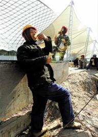 老葛告訴記者,一年前他剛“混”進(jìn)園區(qū),不是賣燒酒,而是賣啤酒。夏日炎炎,有個(gè)世博軸上的江蘇技工幾乎每天都來(lái)光顧,喝啤酒就像喝水一樣。江蘇工人喝多了,話也多。他告訴老葛,自己成天吊在繩索上,趴在上面倒騰的“大喇叭”,叫陽(yáng)光谷。