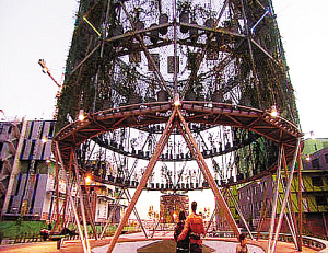 晚上,則一定要先去“生態(tài)氣候樹(shù)”。來(lái)到“氣候樹(shù)”內(nèi)部的公共廣場(chǎng),站在數(shù)百平方米的廣場(chǎng)上,你會(huì)立刻體會(huì)到炎炎夏日的“冰爽”感覺(jué)。因?yàn)檫@里運(yùn)用了先進(jìn)的環(huán)境科技手段,人造出了一個(gè)“露天空調(diào)房”。當(dāng)你欣賞演出、觀看馬德里視頻時(shí),可別忘了琢磨其中奧妙。(千鶴 蘭翔)