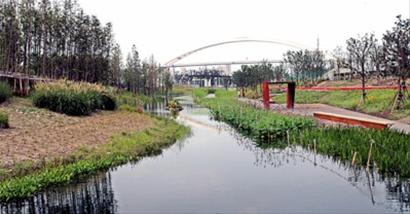 經(jīng)過(guò)三年研究,城市濕地生態(tài)系統(tǒng)方案問(wèn)世了。 2008年,張教授帶領(lǐng)團(tuán)隊(duì)進(jìn)入園內(nèi)施工,在多家單位協(xié)作配合下,把圖紙上的構(gòu)想變成了現(xiàn)實(shí)中的草木叢生、鳶飛魚(yú)躍。