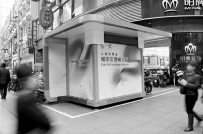 記者所見的這個(gè)“七彩之心”站亭,屬于外建站,地處徐匯區(qū)商業(yè)街“永新坊”,不過(guò)7平方米,主要材料為耐高溫、耐潮濕、耐風(fēng)雨的彩鋼板。外形四四方方,看上去,與東方書報(bào)亭差不多大小,主色調(diào)為白色,四周邊沿則以七色裝飾,如彩帶縈繞。正面卷簾門板上,印著志愿者標(biāo)志——七彩的志愿者之“心”,“上海世博會(huì)城市志愿服務(wù)站”幾個(gè)大字十分醒目。左、右兩側(cè)的門板上,同樣繪有世博會(huì)標(biāo)志和志愿者標(biāo)志,以及世博會(huì)志愿者口號(hào):“世界在你眼前,我們?cè)谀闵磉叀。在站亭的正上方,有一條LED滾動(dòng)顯示屏,滾動(dòng)著“城市,讓生活更美好”等宣傳標(biāo)語(yǔ)。
