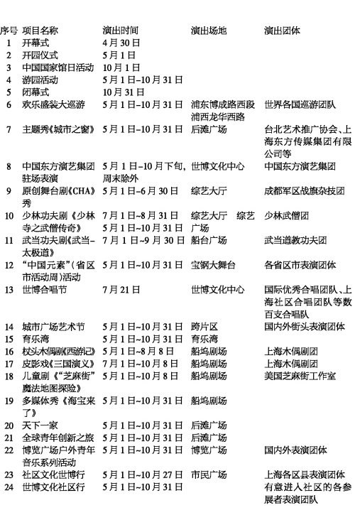 上海世博會期間,世界各地表演團體將帶來2萬多場文藝演出和活動。由東道主組織的19項盛大演出也已準(zhǔn)備就緒,開幕第一天起陸續(xù)在世博園全新的文化中心、綜藝大廳、綜藝廣場、后灘廣場、船臺廣場、寶鋼大舞臺、育樂灣、船塢劇場、博覽廣場、市民廣場一一亮相,生動演繹各國傳統(tǒng)和文化,盛情邀請各國來賓分享和互動——
