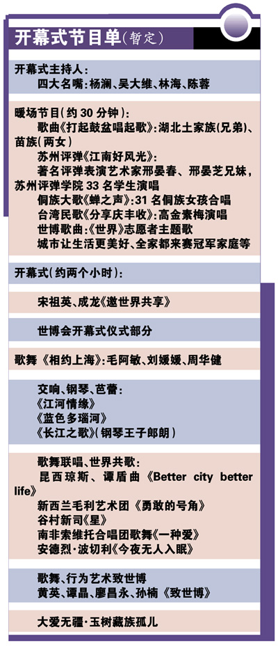 昨天,記者采訪多位參與世博開(kāi)幕式彩排的人員,通過(guò)他們的轉(zhuǎn)述來(lái)為您提前揭開(kāi)開(kāi)幕式的神秘面紗。