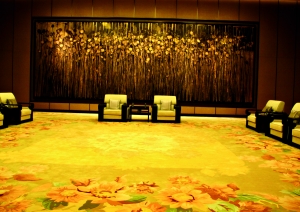 中國(guó)館60.6米層正中為金廳,在五行中,土居中,土色黃,黃色高級(jí)的境界是金,故此廳定位金色,主題以展示向日葵為主。