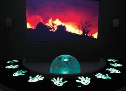從“希臘的一天”中,游客看到了城市生活的繁忙與樂趣,也發(fā)現(xiàn)城市面臨的挑戰(zhàn)與難題。就像在“生態(tài)”那一章中:當(dāng)5位游客同時把雙手按在互動桌上時,屏幕上觸目驚心的環(huán)境污染立即消失,取而代之的是希臘為應(yīng)對挑戰(zhàn)而做的努力,如臨海而建的風(fēng)能發(fā)電場、居民住宅上的太陽能屋頂?shù)。小小的“互動”告訴我們:生態(tài)城市僅僅依靠一個人的努力是不夠的,同心協(xié)力,才會有“更好的生活”。(劉穎)