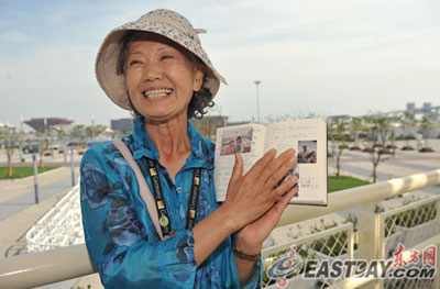 除了要拿上海世博“全勤獎(jiǎng)”,山田奶奶或許還可以獲得“最認(rèn)真游客”的稱號(hào)。每天,她都會(huì)隨身攜帶一本黃色的“世博日記”,全程記錄自己的行程和遇到的人、事。記者看到,本子上蓋滿了各展館的紀(jì)念圖章,還有山田奶奶在各處留下的招牌式的笑容,細(xì)心的她還會(huì)用筆一一記下合影人的名字。